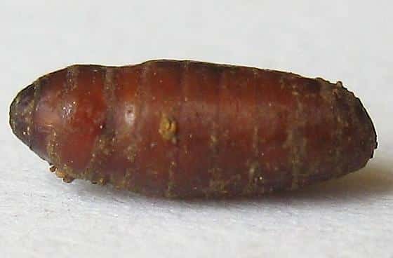 Après dix à quatorze jours, la larve cesse de se nourrir et s’isole pour franchir une nouvelle étape : la pupaison. Sa peau se durcit, l’intérieur se transforme. On appelle alors cette enveloppe une pupe.