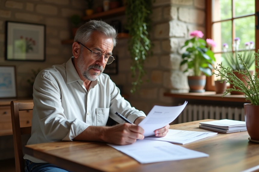 Homme d'âge moyen en chemise en lin consulte des documents fiscaux