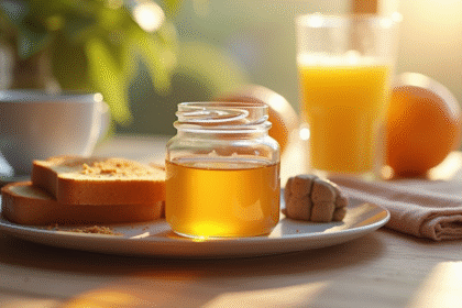 Un pot doré sur la table, une cuillère qui brille sous la…